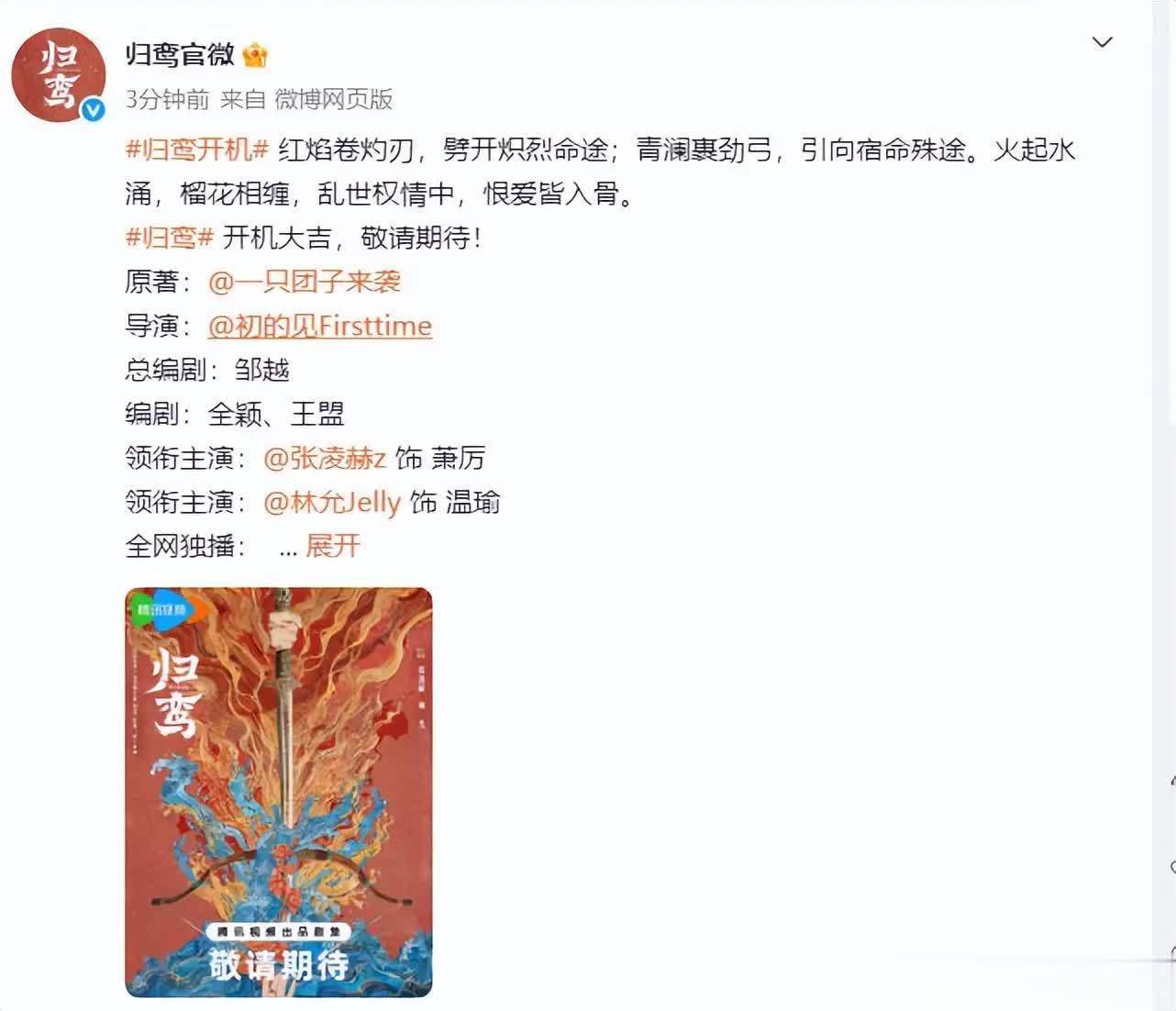 2026 开年古装剧市场再添重磅新作!腾讯视频 S + 级权谋大剧《归鸾》正式官宣开机,官微同步释出主创阵容与开机路透,张凌赫、林允首次搭档挑大梁的消息一出,瞬间引爆全网热议。